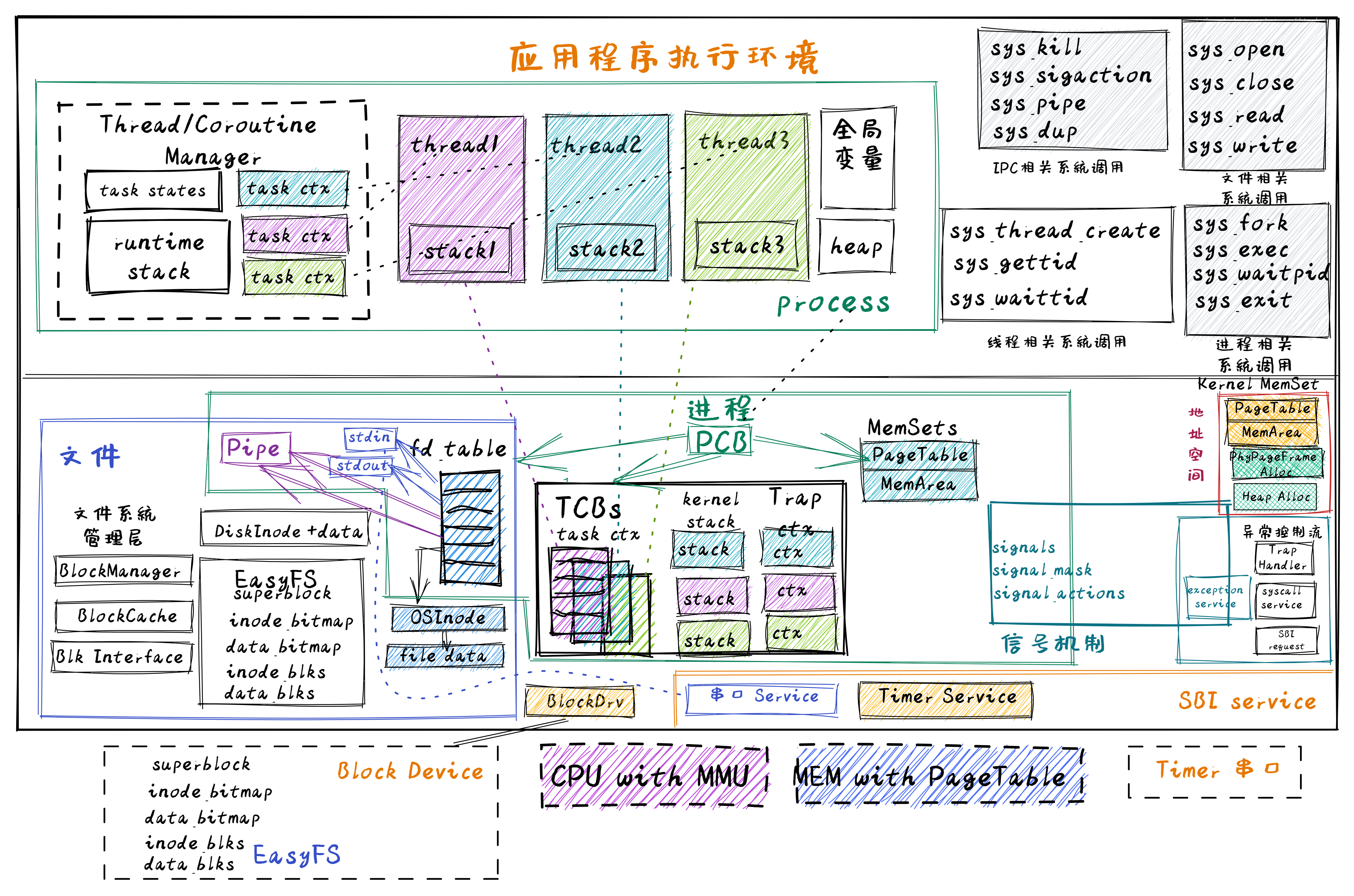 而关于线程切换和线程调度这两部分在之前已经介绍过。线程切换与第三章中介绍的特权级上下文切换和任务上下文切换的设计与实现是一致的,线程执行中的调度切换过程与第六章中介绍的进程调度机制是一致的。这里就不再进一步赘述了。