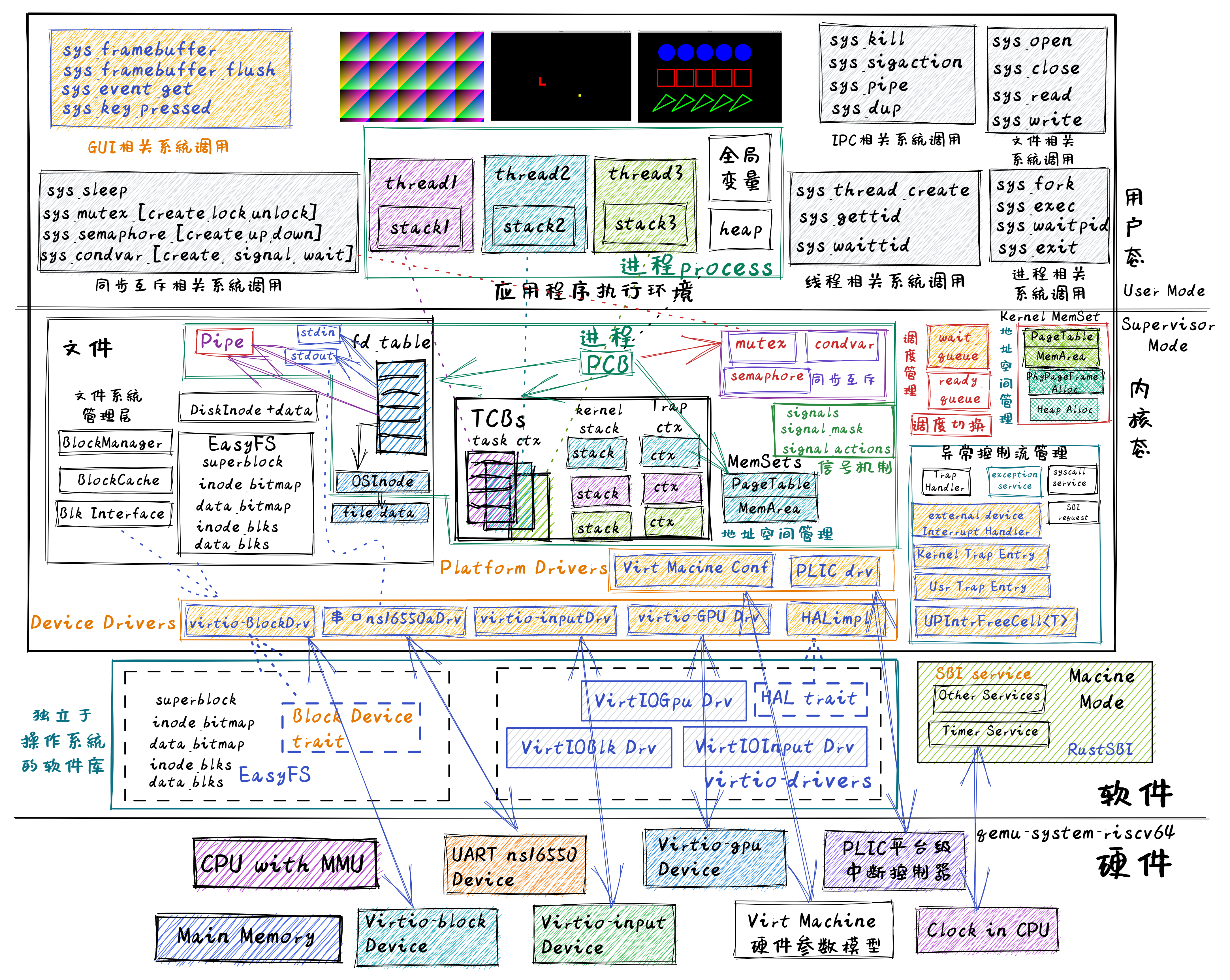 我们先分析一下图的上下两部分。从上图的左上角可以看到为应用程序增加了GUI相关的新系统调用。应用程序可以通过 sys_framebuffersys_framebuffer_flush 来显示图形界面,通过 sys_event_getsys_key_pressed 来接收来自串口/键盘/鼠标的输入事件。这其实就形成了基本的GUI应用支持框架。在上图的中上部,添加了三个GUI应用的图形显示,从左到右分别是: gui_simplegui_snakegui_rect