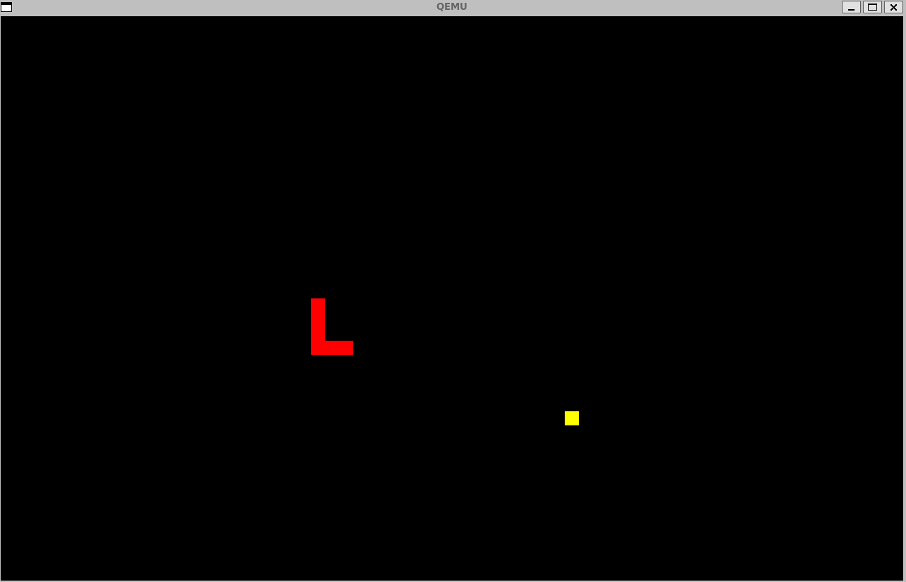 在这个应用中,可以看到 gui_snake 图形应用通过操作系统提供的UART串口驱动和 virtio-gui 显示驱动提供的服务来实现的一个贪吃蛇交互式小游戏。下面是该应用的演示图:其中红色为贪吃蛇,黄色方块为食物。玩家可以使用wasd(分别表示上左下右)控制贪吃蛇的行进方向。由于控制是基于和前面章节一样的命令行标准输入实现的,在游玩的时候需要让焦点位于 user shell 命令行界面,才能成功将控制传递给应用程序。应用画面可以在另一个图形显示窗口看到。